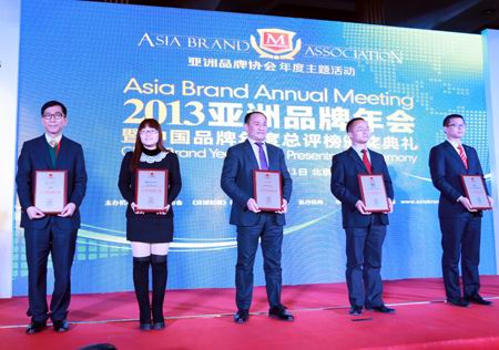 1月11日,由亚洲品牌协会、人民日报《环球时报》社和国家发展改革委中国经济导报社共同举办的“2013亚洲品牌年会暨中国品牌年度总评榜颁奖典礼”在北京西苑饭店盛大召开。***演员张国立先生与主持新星郭洋子共同主持了颁奖典礼。十一届全国人大民族委员会主任马启智,中共中央组织部原常务副部长武连元等领导出席了典礼并为获奖企业颁奖。正大集团以位居第65名的排名荣获“2013中国品牌100强”,并名列“消费者满意十佳(行业)品牌”榜首。董事长办公室(北京)杨海浩总裁代表集团接受荣誉奖牌及证书。