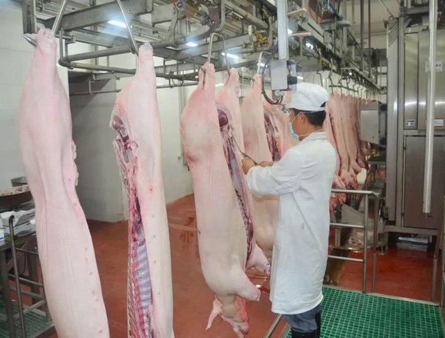 毛猪车辆入厂时严格车轮消毒池和人员专用通道消毒;卸车后经过清洗、消毒、烘干等环节彻底消杀后方可出厂,确保安全;
