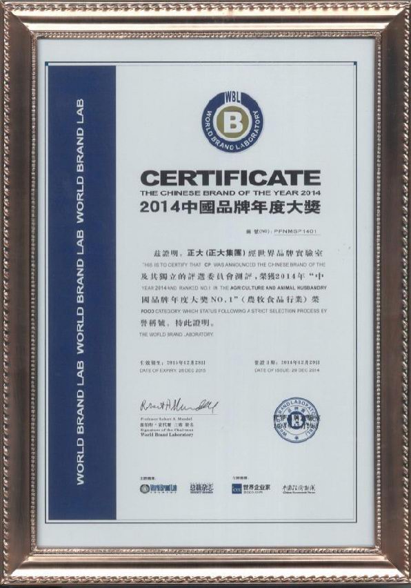2014年12月29日,“总裁世界年会”在北京东方君悦大酒店举行。本次大会揭晓了享有“中国品牌奥斯卡”之称的 “世界品牌实验室2014年中国品牌年度大奖”评选结果,正大集团、中国国航、国家电网、腾讯控股、中国人寿、中国国旅、北汽集团、华为技术、长虹电器等30个活跃在中国经济舞台的领军品牌荣获 “中国品牌年度大奖”,正大集团以在农牧食品业多年的探索实践和管理经验,以及良好的产品品质和品牌知名度,荣获农牧食品行业“中国品牌年度大奖***”荣誉称号。哈佛商学院教授约翰•戴腾博士(John Deighton)、耶鲁大学管理学院教授莱维·多尔博士(Ravi Dhar)分别进行颁奖及致词。