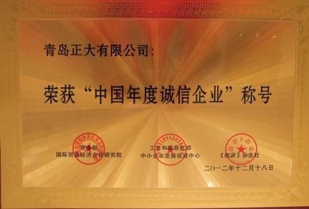 在商务部国际贸易经济合作研究院、工业和信息化部中小企业发展促进中心、《经济》杂志社联合组织的2012年“中国年度诚信企业”评选活动中,青岛正大有限公司荣获“中国年度诚信企业”殊荣。